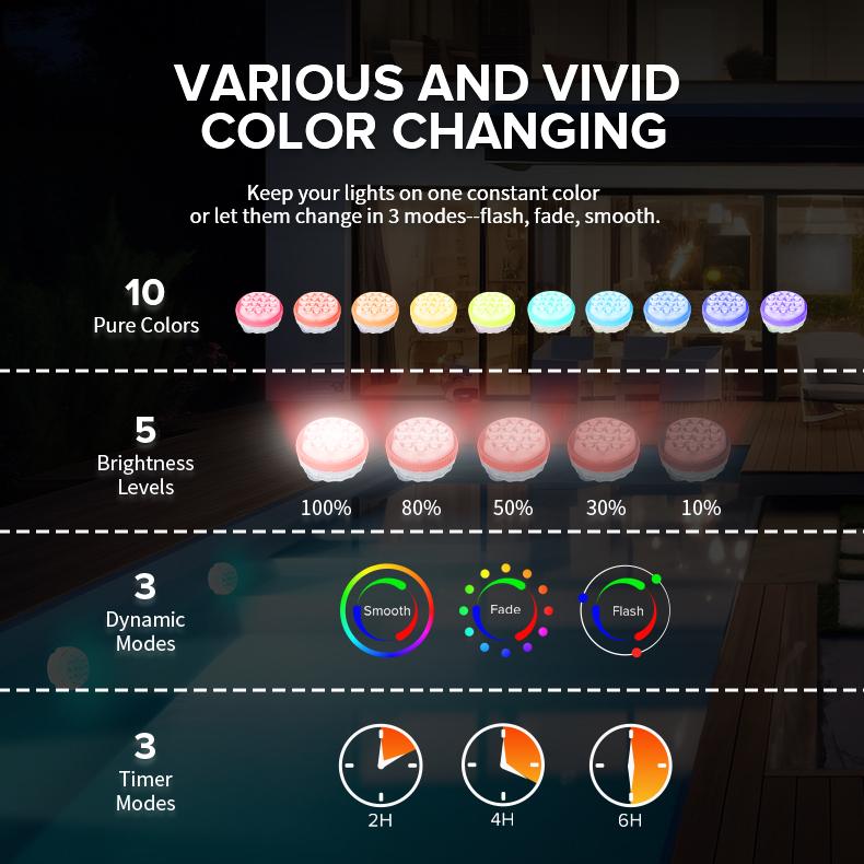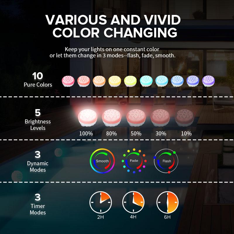The Sansi Upgraded Wireless Rechargeable Pool Lights are the perfect addition to any outdoor lighting setup.These submersible RGB LED pond lights feature a fully sealed design that is both waterproof and long-lasting, making them ideal for use in pools and other outdoor landscapes.